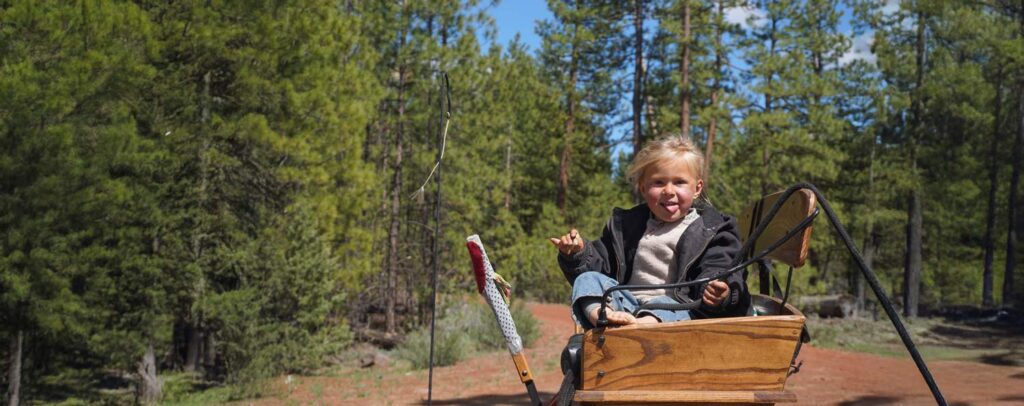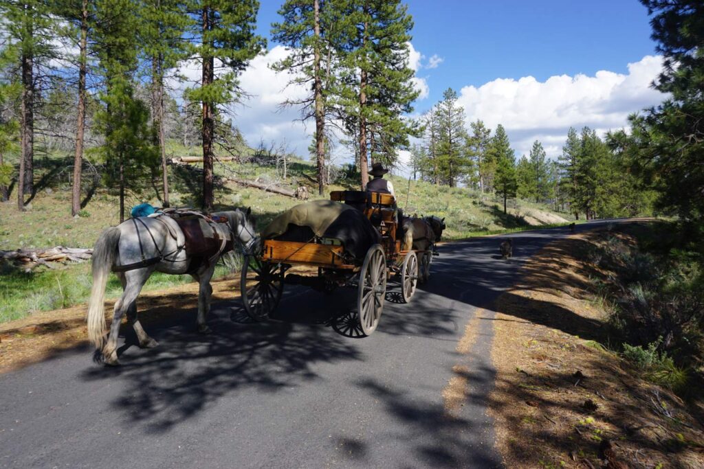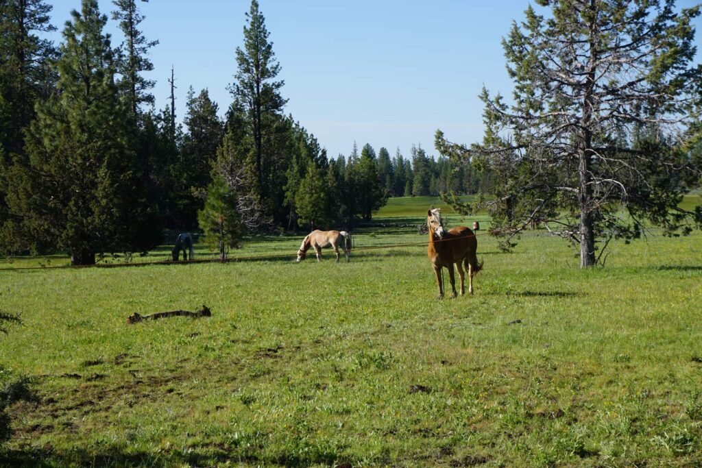 After our rest at the first lake, we quickly made our way into Oregon. We were challenged by the first steep hill. It was short and not that bad after all. It made us quite nervous, because the breaks of our carriage are very limited. Just a wooden block that presses on the tire, when the carriage is fully loaded, that doesn’t stop the carriage, it can only slow it down to a certain degree. The rest of the work is passed on to the horses who don’t like that pressure from behind very much. It’s straining work for them. Entering Oregon, the green’s seem a little brighter. We enjoy the nature that passes by slowly huge pine trees and patches of beautiful wildflowers.