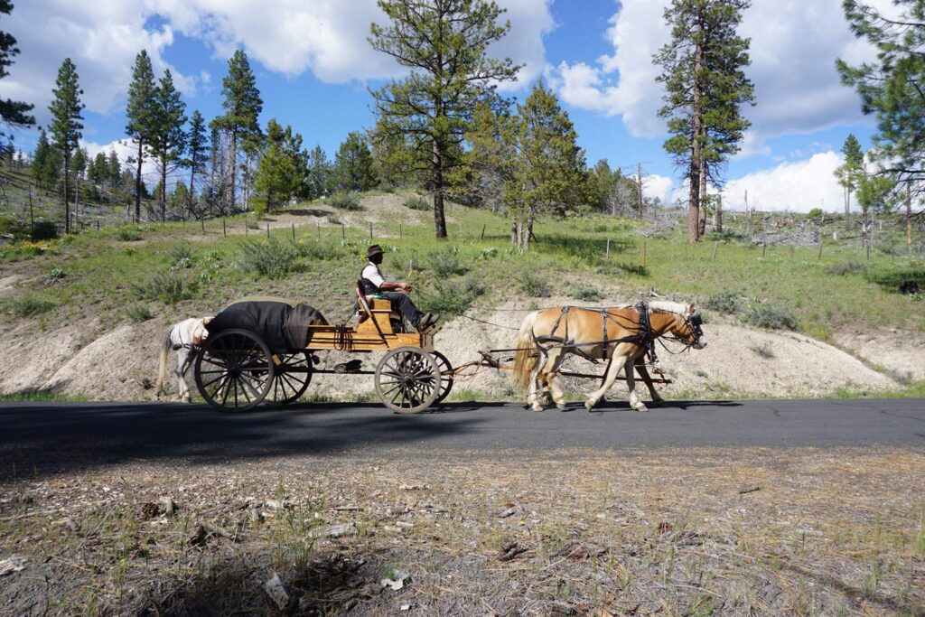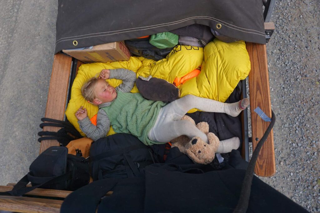 On the next day, we travel on we area all groved in pretty good, it’s the first day that Rosie actually naps on the carriage, she does great and that nap was needed, she slept for hours. So she didn’t even notice the trouble that we had with long, wining downhill roads. But we found out, that when one of us gets off, its already much better for the breaks and the horses. That way we manage to drive some steeper slopes. And at the end of the day, finally make it to the next lake. It’s Memorial day and many people are out in nature, so it’s a little harder to find a good spot for our camp. Usually, we like to stay away from people, but this time we find a beautiful meadow that has roads on both sides. But it’s a good view and plenty of feed for the horses. We are all tired, so we decide to stay.